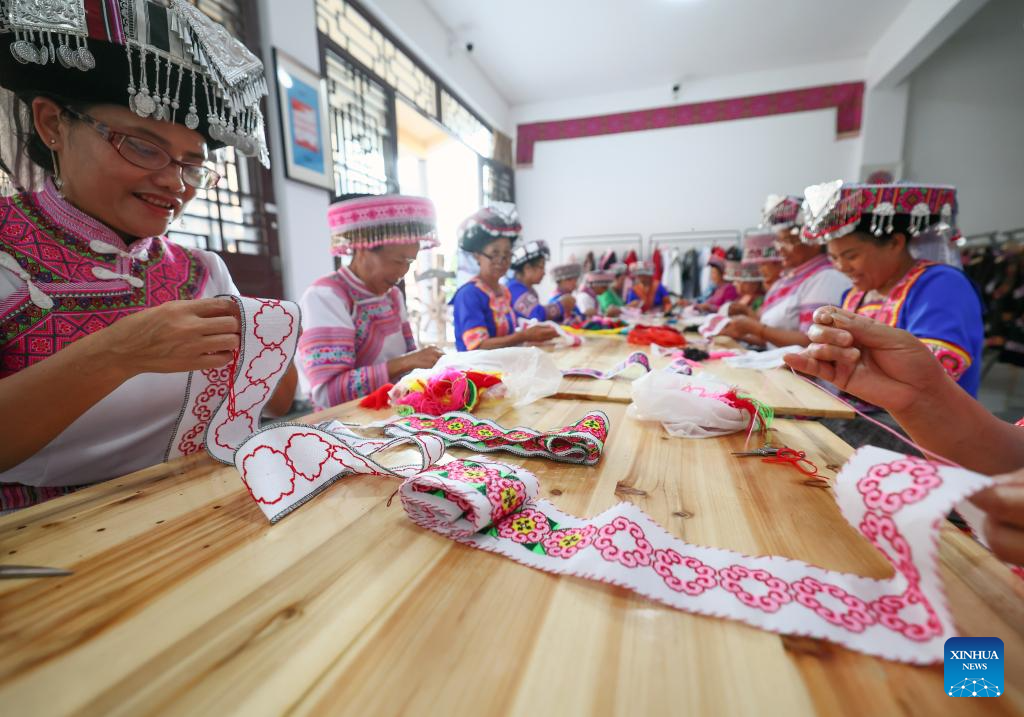 Women of Miao ethnic group make embroidery works at a workshop in Pingbian Miao Autonomous County, southwest China's Yunnan Province, June 1, 2023. Pingbian Miao Autonomous County has been making efforts to support and develop its embroidery industry, trying to provide job opportunities to local women. (Xinhua/Lan Hongguang)