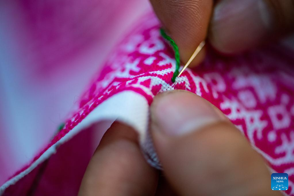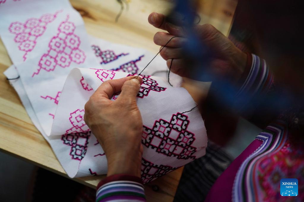A woman of Miao ethnic group makes embroidery works at a workshop in Pingbian Miao Autonomous County, southwest China's Yunnan Province, June 1, 2023. Pingbian Miao Autonomous County has been making efforts to support and develop its embroidery industry, trying to provide job opportunities to local women. (Xinhua/Jiang Wenyao)
