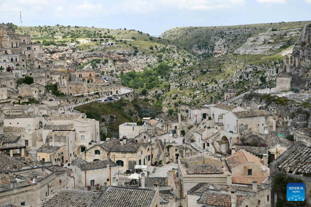 This photo taken on June 1, 2023 shows the Sassi and the Park of the Rupestrian Churches of Matera in the southern region of Basilicata, Italy. Matera's Sassi and Park of the Rupestrian Churches were inscribed on the UNESCO World Heritage List in 1993. (Xinhua/Jin Mamengni)