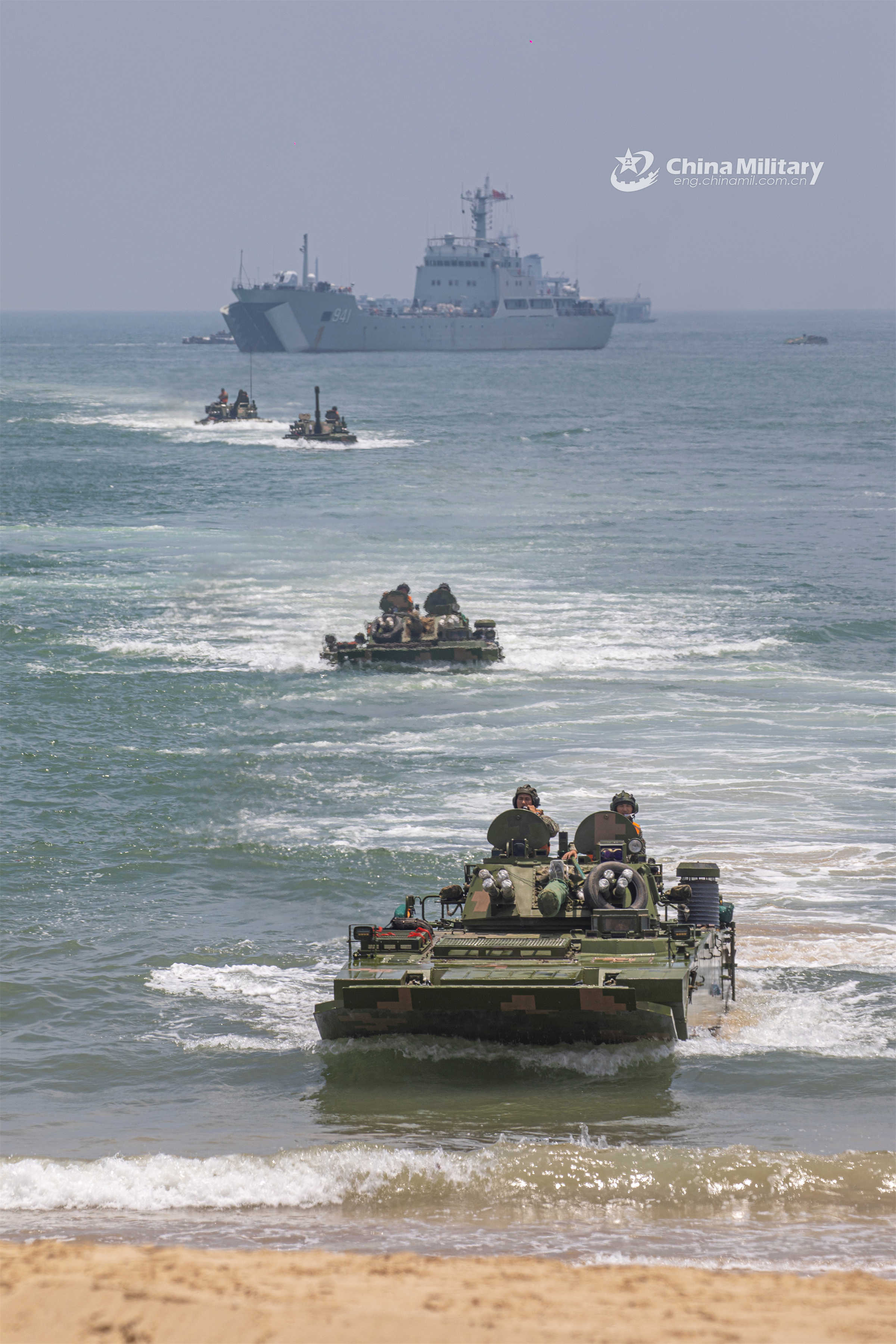 Amphibious armored vehicles attached to a brigade under the PLA 73rd Group Army maneuver in assault wave formation towards the beach-head during a maritime embarkation and debarkation exercise jointly conducted with a naval landing ship on May 16, 2023. (eng.chinamil.com.cn/Photo by Xiao Zubin)
