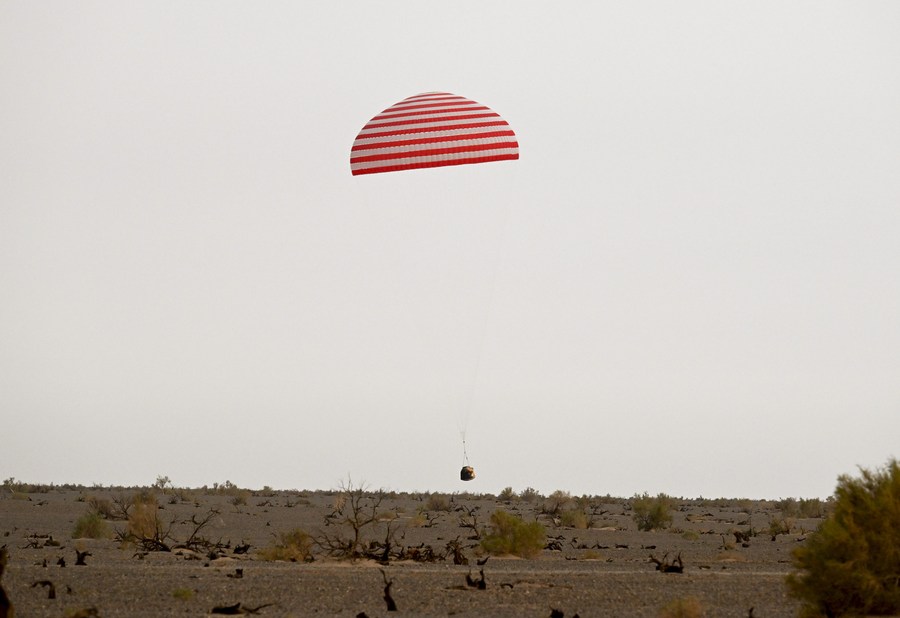 Shenzhou-15's return capsule, carrying astronauts Fei Junlong, Deng Qingming and Zhang Lu, touched down at the Dongfeng landing site in north China's Inner Mongolia Autonomous Region at 6:33 a.m. (Beijing Time), according to the China Manned Space Agency (CMSA).