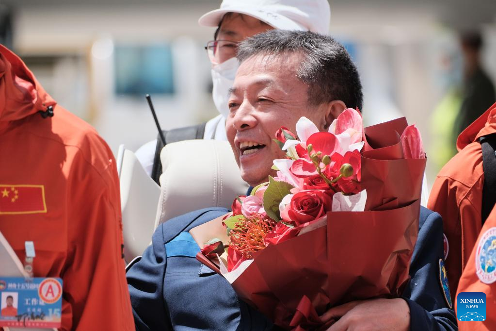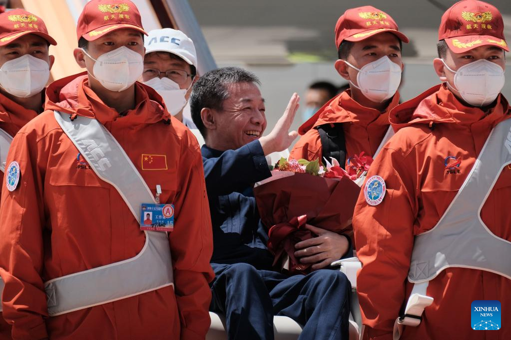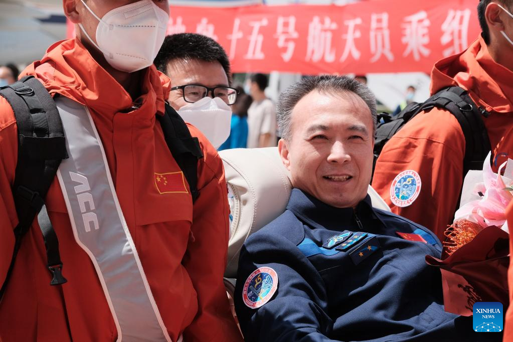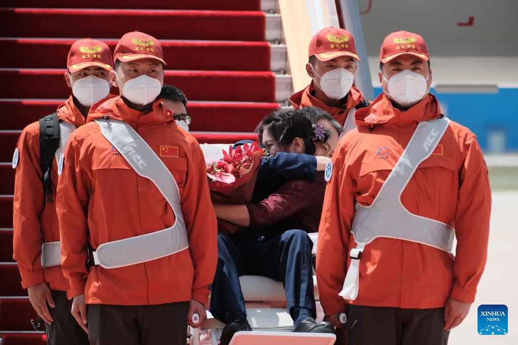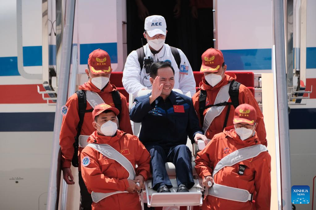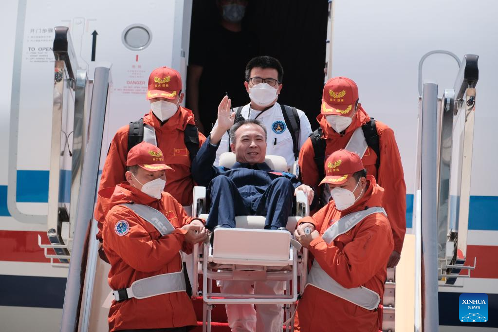 BEIJING, June 4 (Xinhua) -- The three astronauts from China's Shenzhou-15 manned spaceship arrived in Beijing by plane on Sunday after their safe return to Earth following a six-month space station mission.