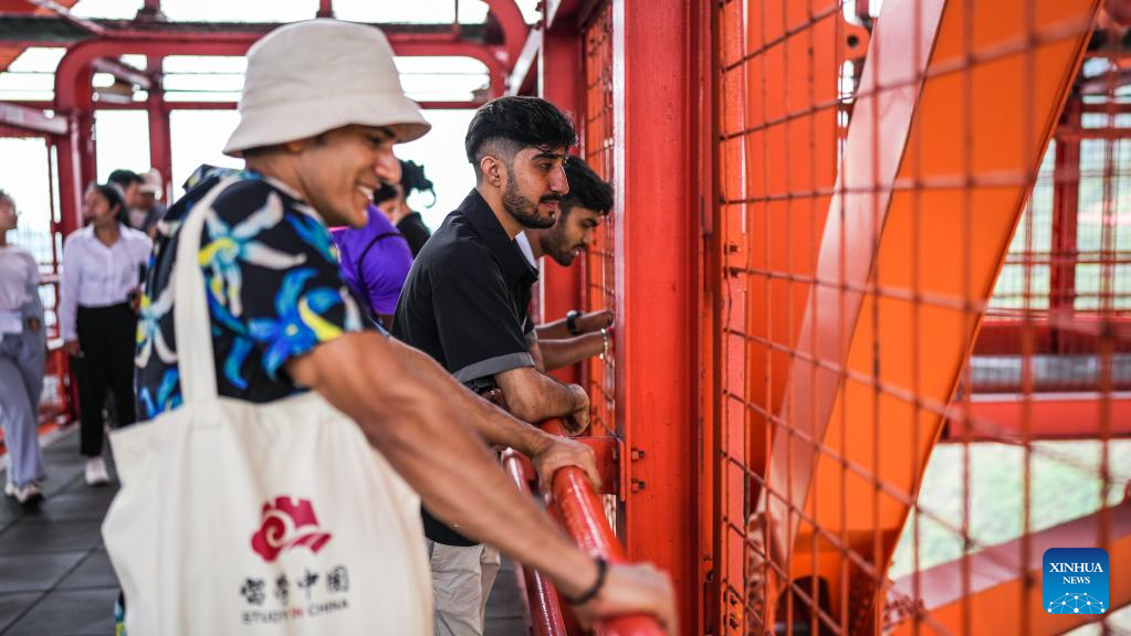 International students visit the Baling River bridge in southwest China's Guizhou Province, June 3, 2023. A total of 40 international students from 24 countries have recently attended a culture promotion activity to learn about Guizhou Province, especially its achievements in transport infrastructure construction and rural revitalization. (Xinhua/Tao Liang)