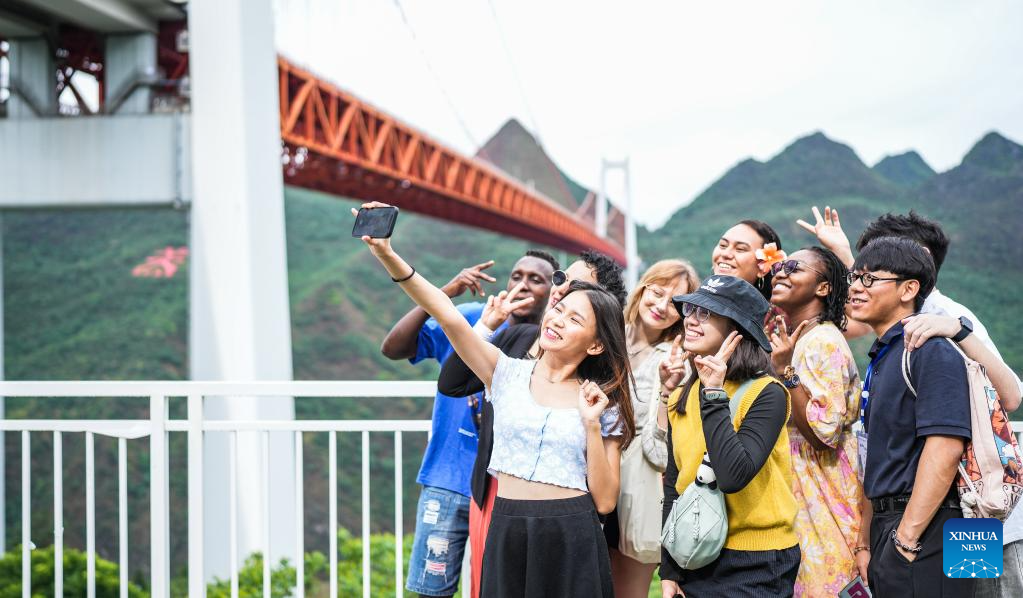 International students take a selfie while visiting the Baling River bridge in southwest China's Guizhou Province, June 3, 2023. A total of 40 international students from 24 countries have recently attended a culture promotion activity to learn about Guizhou Province, especially its achievements in transport infrastructure construction and rural revitalization. (Xinhua/Tao Liang)