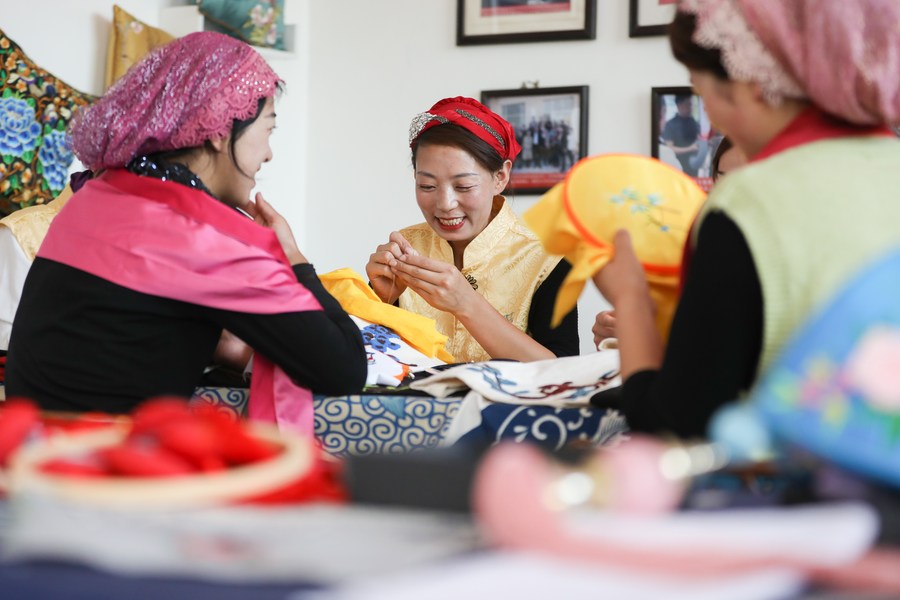 Ma Semai (C) and her colleagues make embroidery works at an embroidery workshop in Daban Town of Dongxiang Autonomous County, Linxia Hui Autonomous Prefecture of northwest China's Gansu Province, May 30, 2020. (Photo by Ma Xiping/Xinhua)