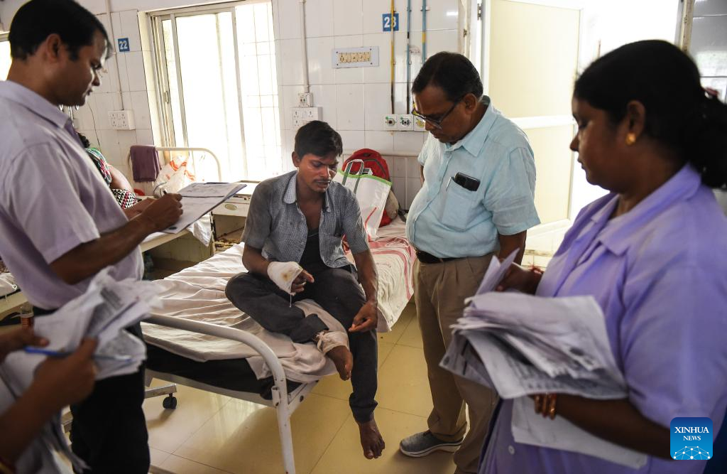 An injured passenger of a train collision receives medical examination at a hospital in Balasore district of the eastern Indian state of Odisha, June 4, 2023. (Xinhua/Javed Dar)