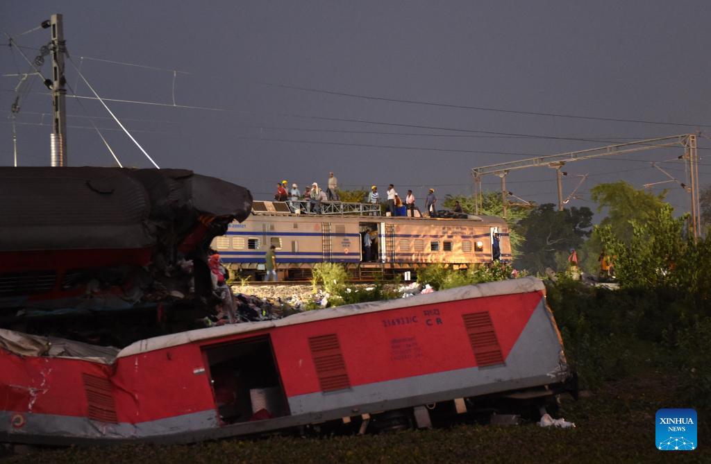 Rescuers remove debris of damaged trains from the railway track at the site of a train collision in Balasore district of eastern Indian state of Odisha, June 4, 2023. (Xinhua/Javed Dar)