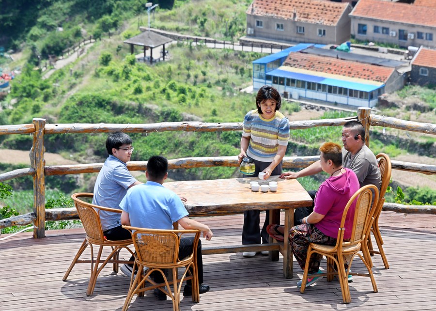 Tourists enjoy tea at a homestay on the Lingshan Island in Qingdao, east China's Shandong Province, June 5, 2023. (Xinhua/Li Ziheng)