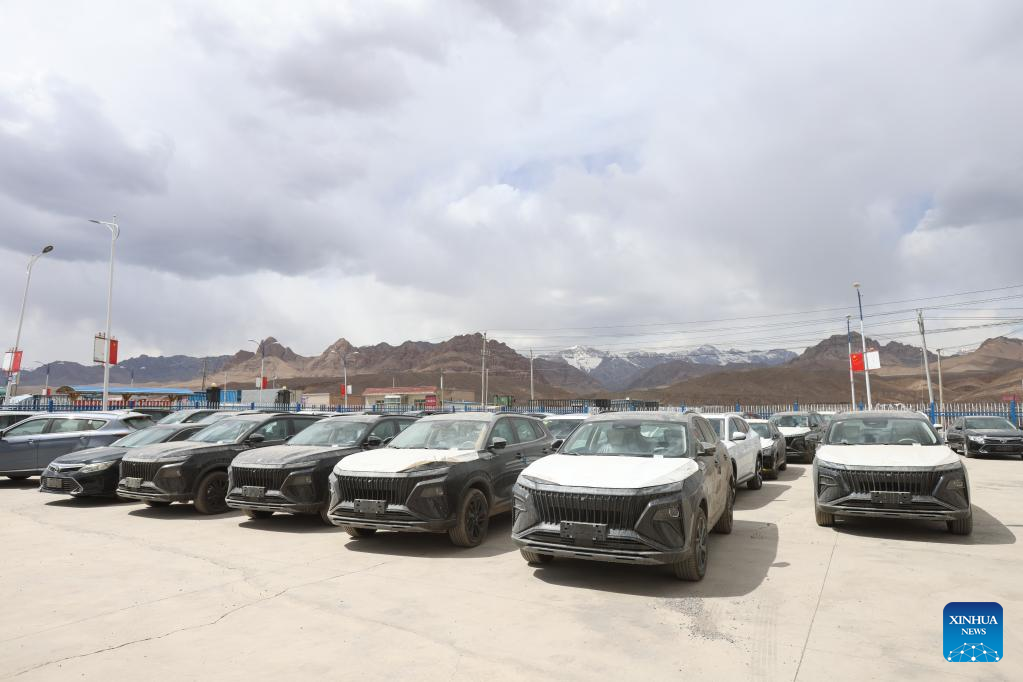 This photo taken on April 25, 2023 shows vehicles to be exported at the Irkeshtam port in the Kizilsu Kirgiz Autonomous Prefecture, northwest China's Xinjiang Uygur Autonomous Region. (Xinhua/Hao Zhao)