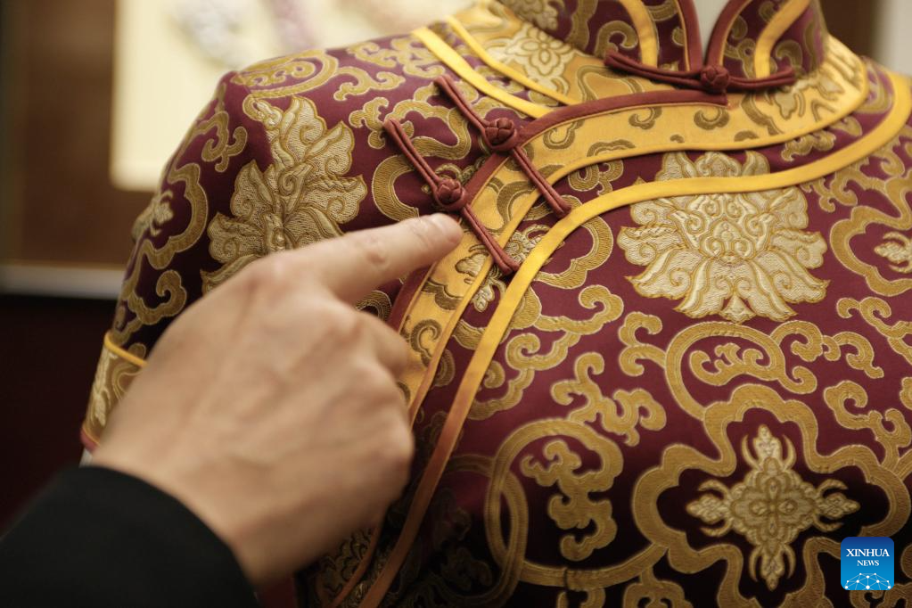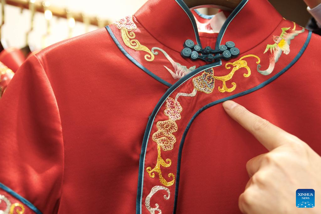 Cheongsams with dragon and phoenix patterns are seen at the Longfeng Cheongsam store in Shanghai, east China, May 30, 2023. (Xinhua/Liu Ying)
