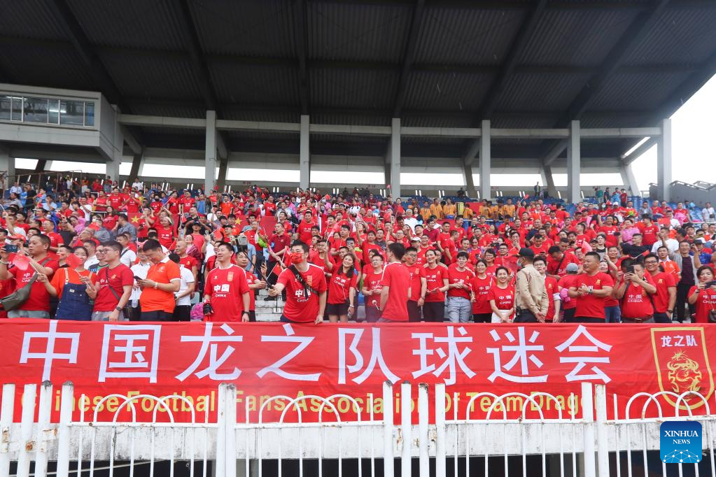 Fans of Team China cheer during the 2nd round match of the AFC U-20 Women's Asian Cup Qualifiers between China and Chinese Taipei at Thuwana Stadium in Yangon, Myanmar, June 6, 2023. (Photo by Myo Kyaw Soe/Xinhua)