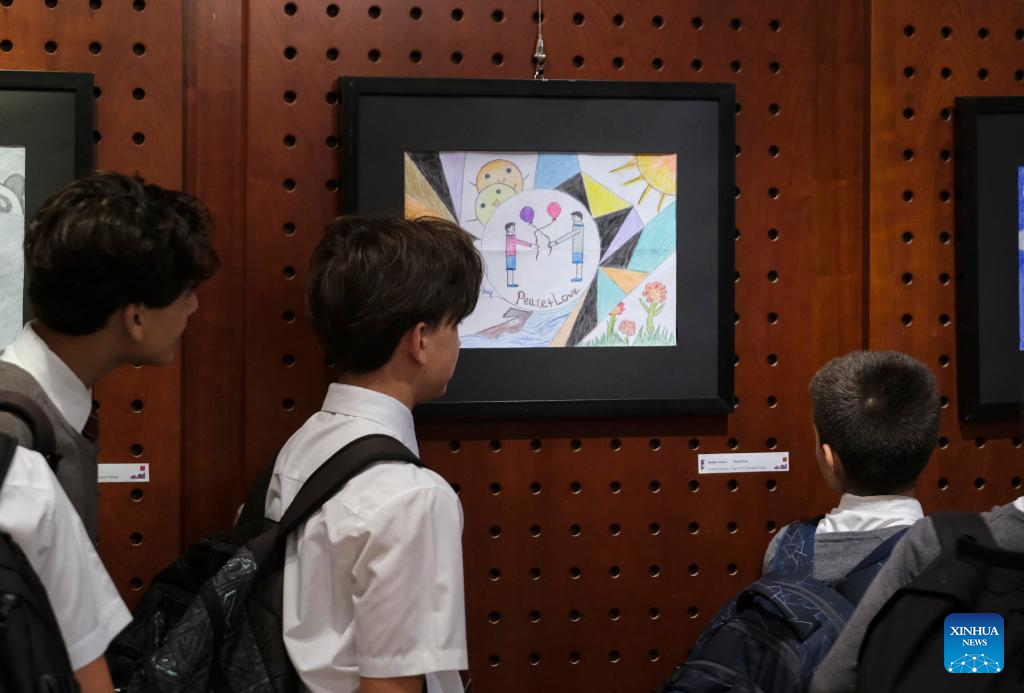 Students view an award-winning artwork at an awards ceremony for the 14th "Imagining China" children's art competition in Valletta, Malta, on June 6, 2023. An exhibition showcasing the tea culture of Xi'an, Shaanxi Province in northwest China, commenced on Tuesday at the China Cultural Centre in Malta. (Photo by Jonathan Borg/Xinhua)