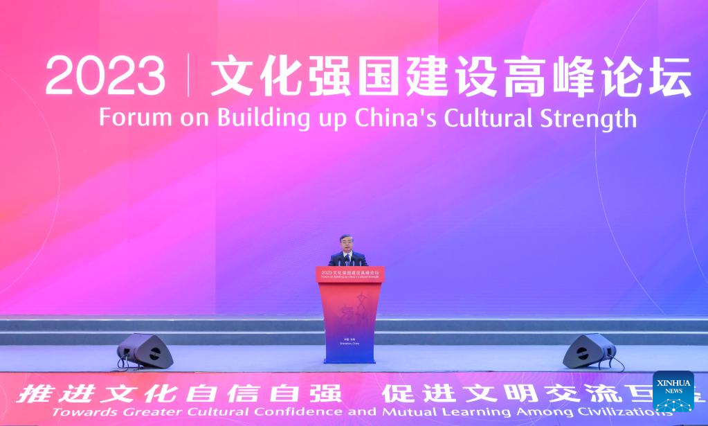 Li Shulei, a member of the Political Bureau of the Communist Party of China (CPC) Central Committee and head of the Publicity Department of the CPC Central Committee, reads out Xi Jinping's congratulatory letter to the first Forum on Building up China's Cultural Strength and delivers a keynote speech at the forum in Shenzhen, south China's Guangdong Province, June 7, 2023. Chinese President Xi Jinping, also general secretary of the CPC Central Committee and chairman of the Central Military Commission, has sent a congratulatory letter to the first Forum on Building up China's Cultural Strength, which opened Wednesday in Shenzhen, south China's Guangdong Province. (Xinhua/Ding Lin)