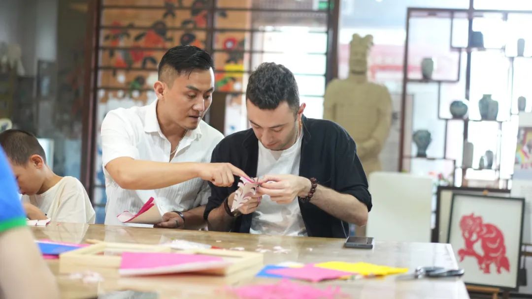 Wang Ning, an inheritor of the intangible cultural heritage of paper-cutting, teaches Louay Ali Dib from Syria during a workshop at Mission Hills Maker in Longhua District on Saturday. Several art salons, workshops and exhibitions were held over the weekend at Mission Hills Maker, one of the subvenues of the 19th China (Shenzhen) International Cultural Industries Fair (ICIF) that opens tomorrow, as warm-up events for the fair. Photos by Liu Xudong