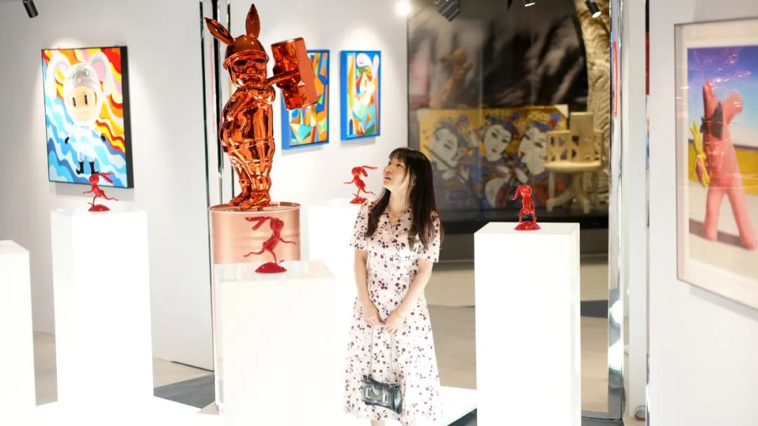 A visitor is attracted by a sculpture at an ongoing exhibition titled "Rabbit in the Eyes of 21 Artists" at the Art Design Center in Luohu District on Thursday. The center is a subvenue of the 19th China (Shenzhen) International Cultural Industries Fair.?