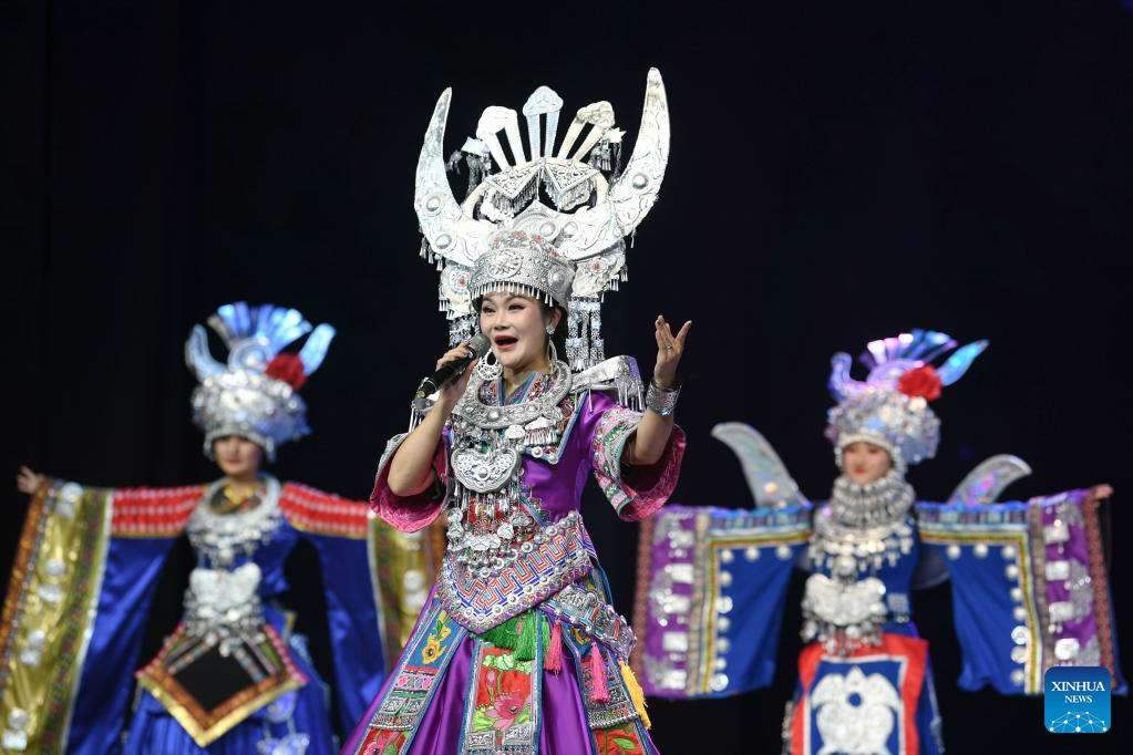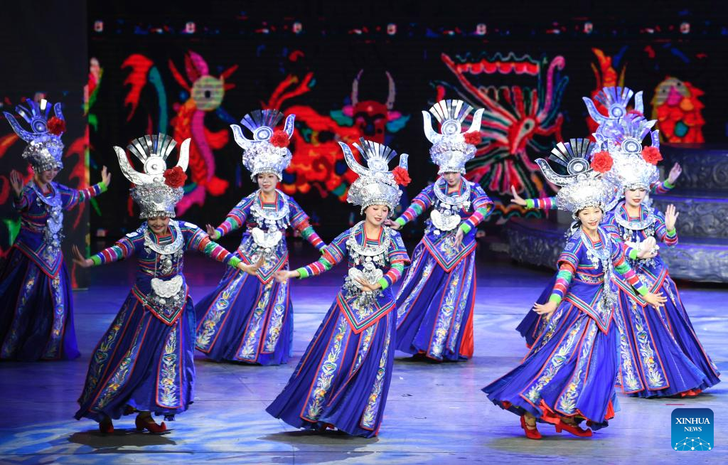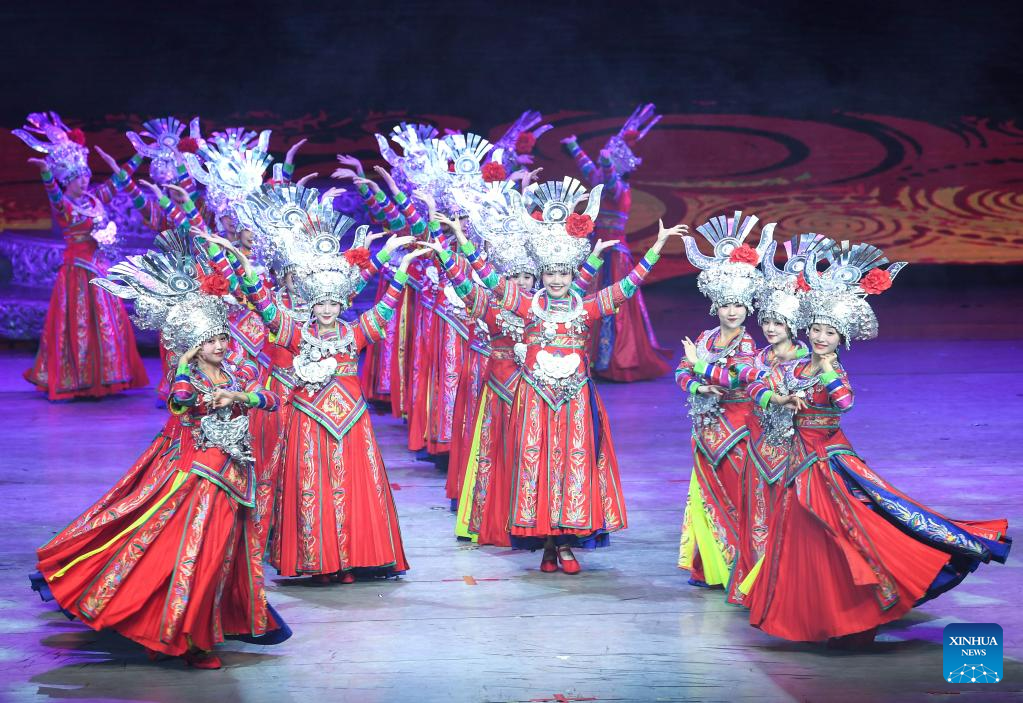 Actors perform in the show "Colorful Guizhou Style" at Guiyang Grand Theatre in Guiyang, southwest China's Guizhou Province, June 5, 2023. The "Colorful Guizhou Style" show, which debuted in 2006, has been performed in over 40 countries or regions worldwide and seen by over 10 million people. The show illustrates the vibrant ethnic culture of Guizhou and the hospitable people living there. (Xinhua/Yang Wenbin)