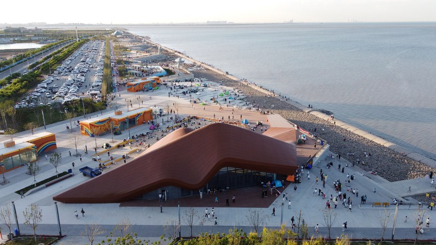 Aerial photo taken on June 5, 2021 shows Dongjiang coastal park in the Binhai New Area of north China's Tianjin. (Xinhua/Zhao Zishuo)