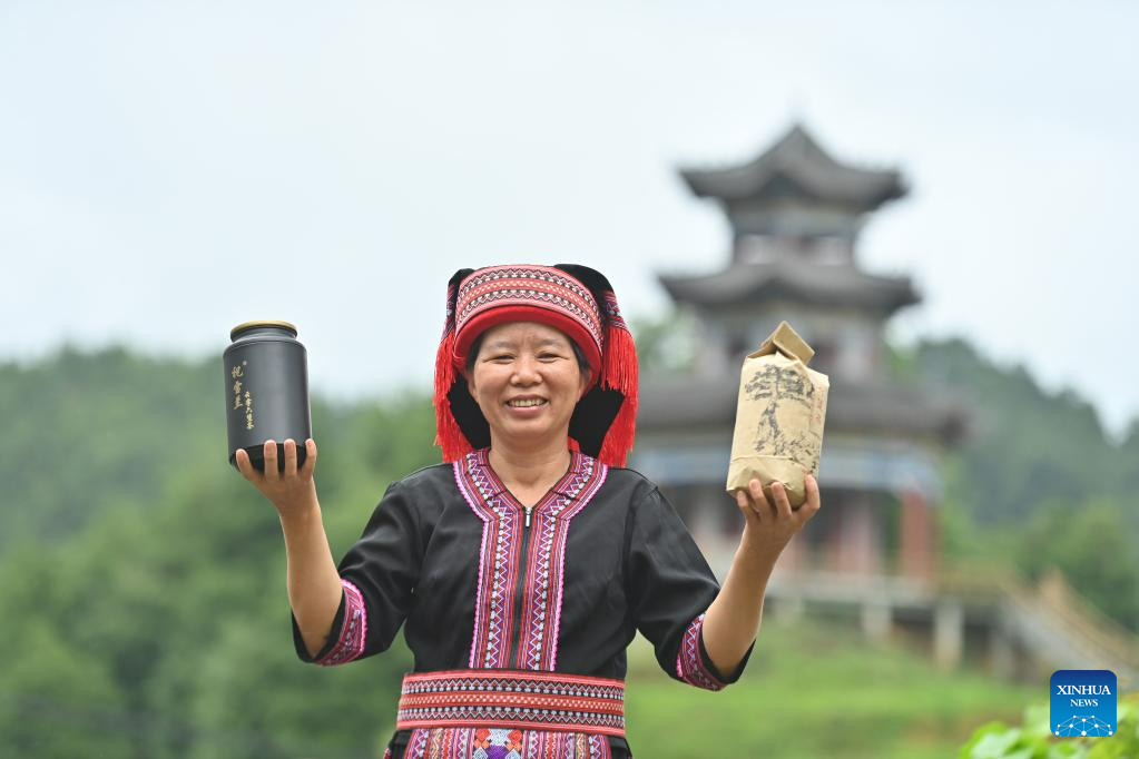 Zhu Xuelan demonstrates the tea she made at Shanping Village of Cangwu County, south China's Guangxi Zhuang Autonomous Region, June 7, 2023. Zhu Xuelan, Party secretary of Shangping Village and representative inheritor of Liubao tea making technique, has promoted traditional tea making technique and developed the tea planting industry to increase local residents' incomes. (Xinhua/Huang Xiaobang)