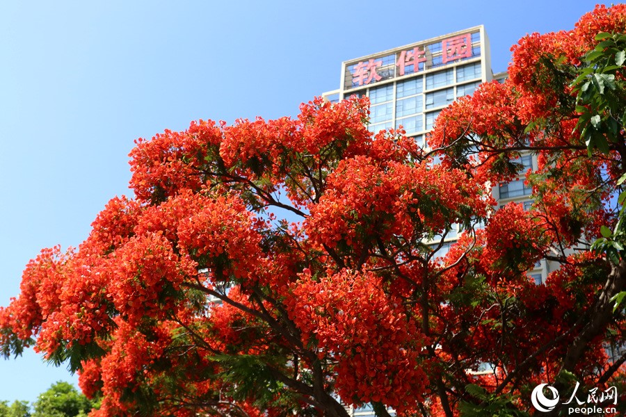Beautiful flame trees at the second phase of Xiamen Software Park in Xiamen city, southeast China's Fujian Province. (People's Daily Online/Chen Bo)