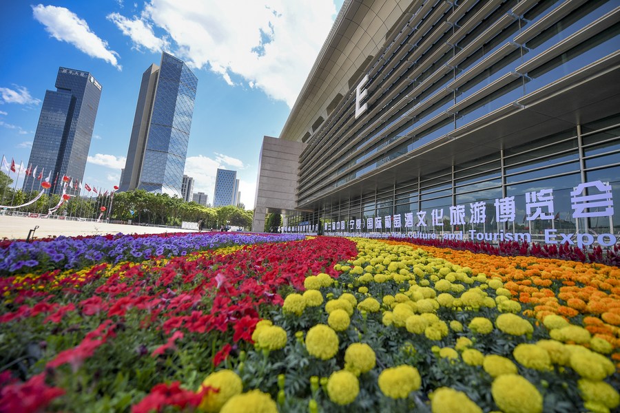 This photo taken on June 9, 2023 shows an exterior view of the venue of a wine-themed international conference and an expo in Yinchuan, northwest China's Ningxia Hui Autonomous Region. (Xinhua/Feng Kaihua)
