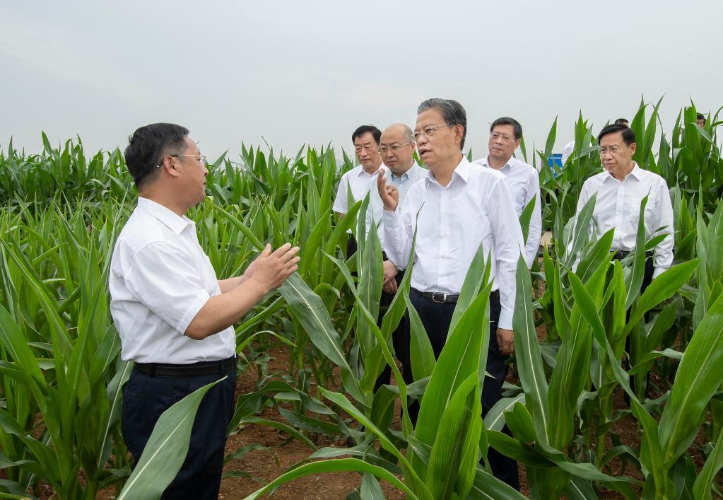 Zhao Leji, a member of the Standing Committee of the Political Bureau of the Communist Party of China Central Committee and chairman of the National People's Congress Standing Committee, learns about seed breeding and germplasm resources at the Modern Agricultural Science and Technology Innovation Demonstration Park of Sichuan Academy of Agricultural Sciences in southwest China's Sichuan Province, June 8, 2023. Zhao made a research tour in southwest China's Sichuan Province from Tuesday to Friday. Leading an inspection team, Zhao examined the enforcement of the Seed Law in several cities in Sichuan. (Xinhua/Li Tao)