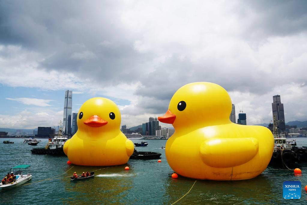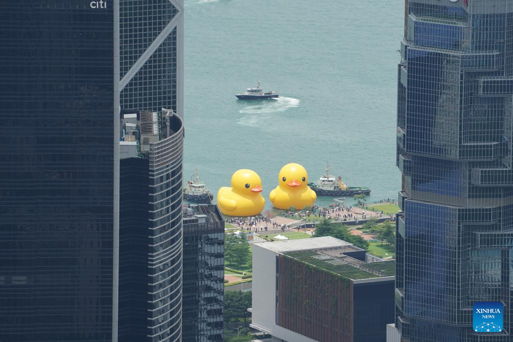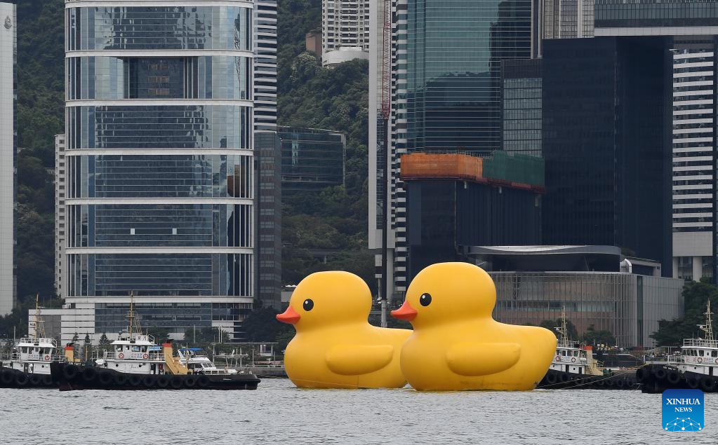 HONG KONG, June 9 (Xinhua) -- A pair of giant rubber ducks captured the attention of Hongkongers on Friday as they floated in Victoria Harbor as part of a public art exhibition that aims to bring more joy to the city.