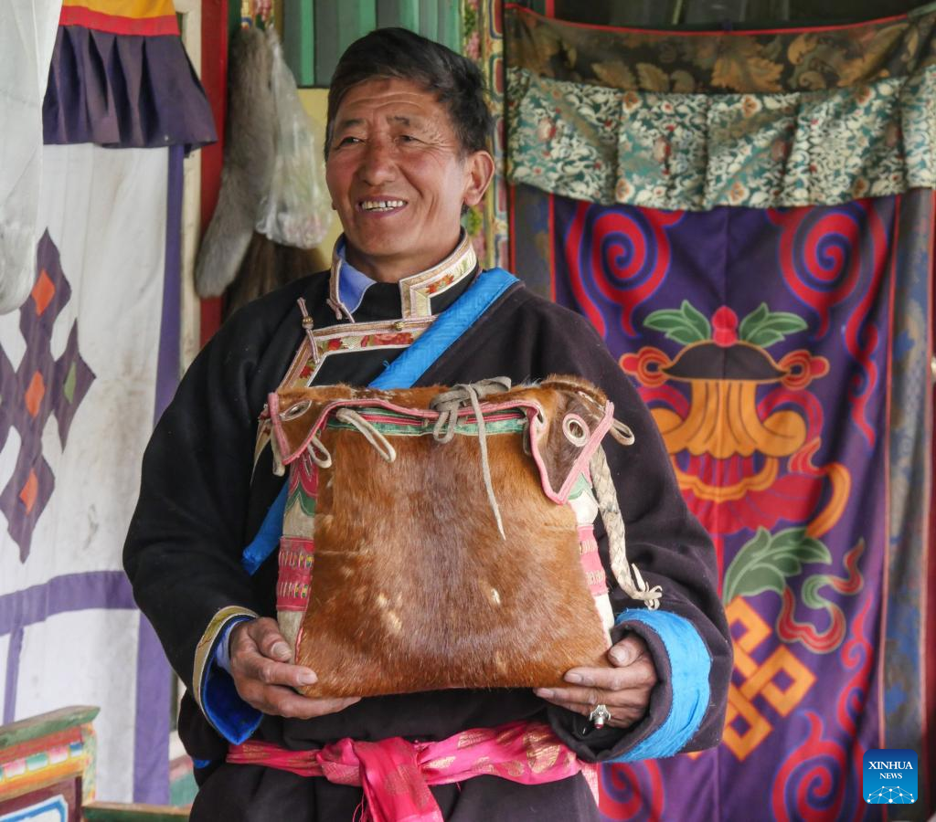 Sonam Chophel demonstrates a saddlebag he made in Thomai Village of Nyingchi City, southwest China's Tibet Autonomous Region, April 19, 2023. (Xinhua/Liu Zhoupeng)