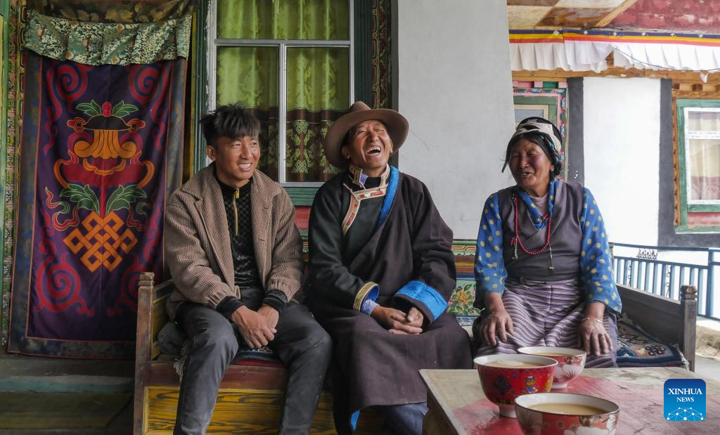 Sonam Chophel (C) is pictured with his family in Thomai Village of Nyingchi City, southwest China's Tibet Autonomous Region, April 19, 2023. (Xinhua/Liu Zhoupeng)