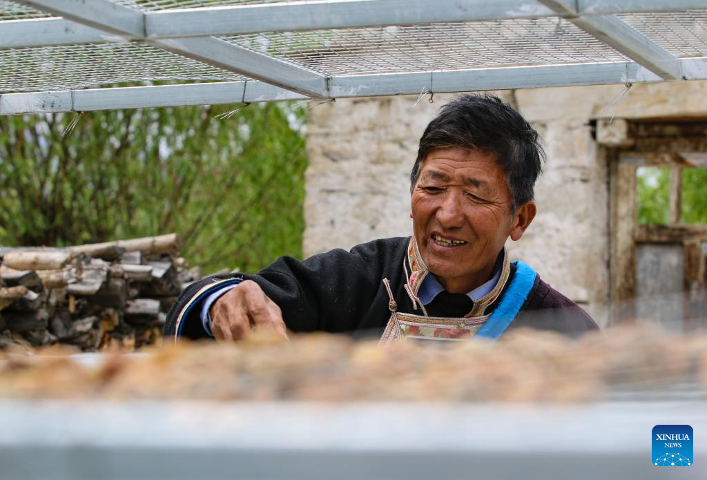 Sonam Chophel air-dries peach slices in Thomai Village of Nyingchi City, southwest China's Tibet Autonomous Region, April 19, 2023. (Xinhua/Nie Yi)