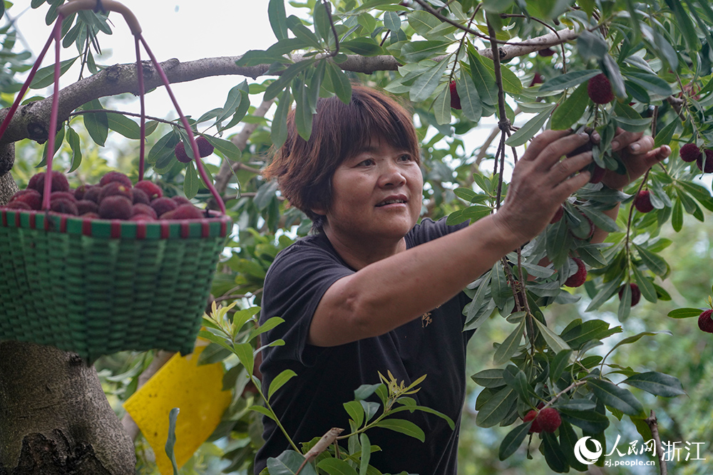 Photo taken on June 8 shows a farmer picking Chinese bayberries at an orchard in Xianju county, Taizhou city, east China's Zhejiang Province. (People's Daily Online/Zhang Yongtao)