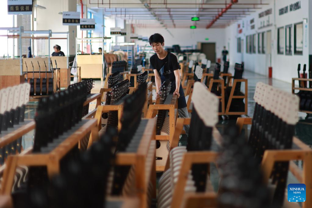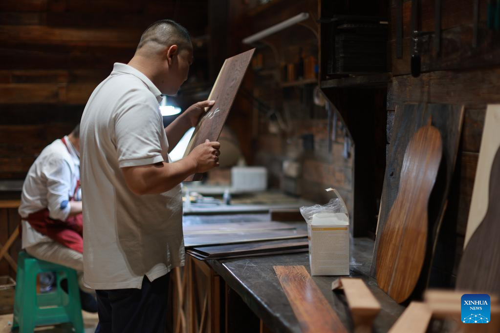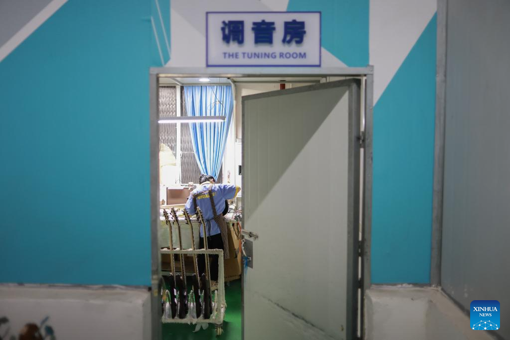A worker tunes a guitar at the Zheng'an Guitar Industrial Park in Zheng'an County, southwest China's Guizhou Province, June 7, 2023.