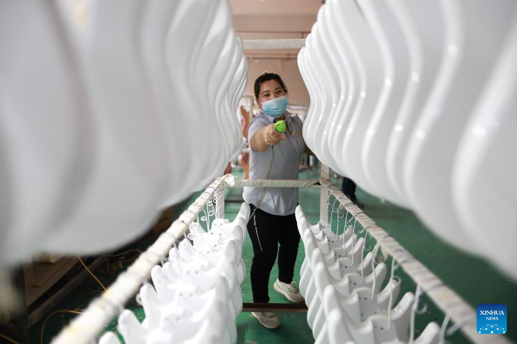 A worker processes guitar moulds at the Zheng'an Guitar Industrial Park in Zheng'an County, southwest China's Guizhou Province, June 7, 2023.