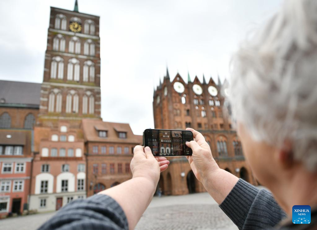A visitor takes photos in downtown Stralsund, northeastern Germany, June 1, 2023. (Xinhua/Ren Pengfei)