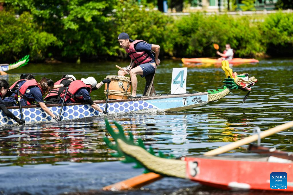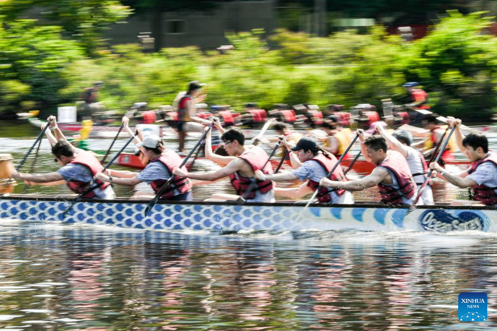 Participants compete at Boston Hong Kong Dragon Boat Festival in Cambridge, Massachusetts, the United States, on June 11, 2023. More than 60 teams took part in this event on Sunday. (Photo by Ziyu Julian Zhu/Xinhua)