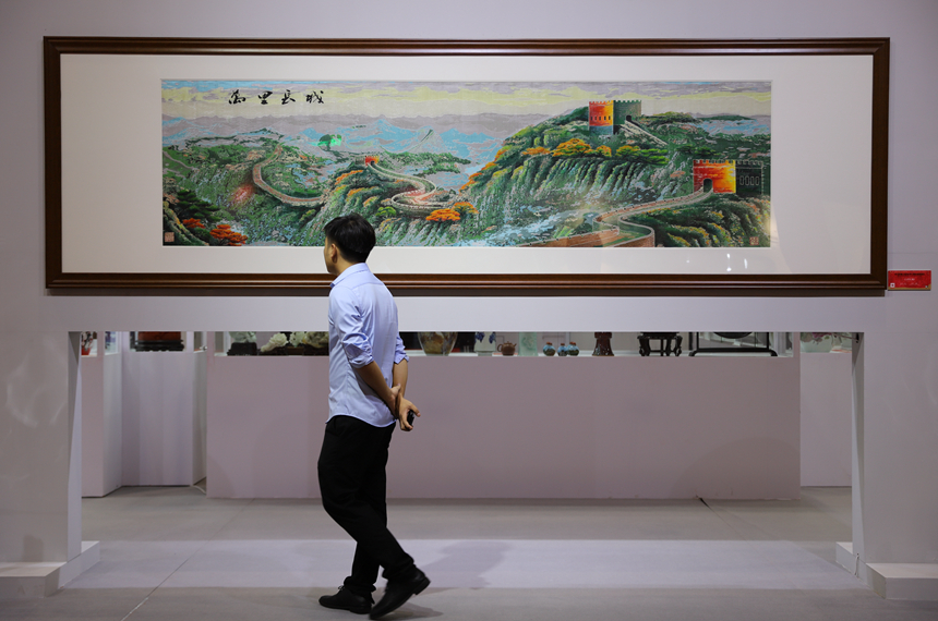 A visitor looks at a Yun brocade artwork entitled "The Great Wall" during an exhibition of works by Chinese arts and crafts masters. Yun brocade is a traditional Chinese silk brocade. (Photo/Cao Huanqing)