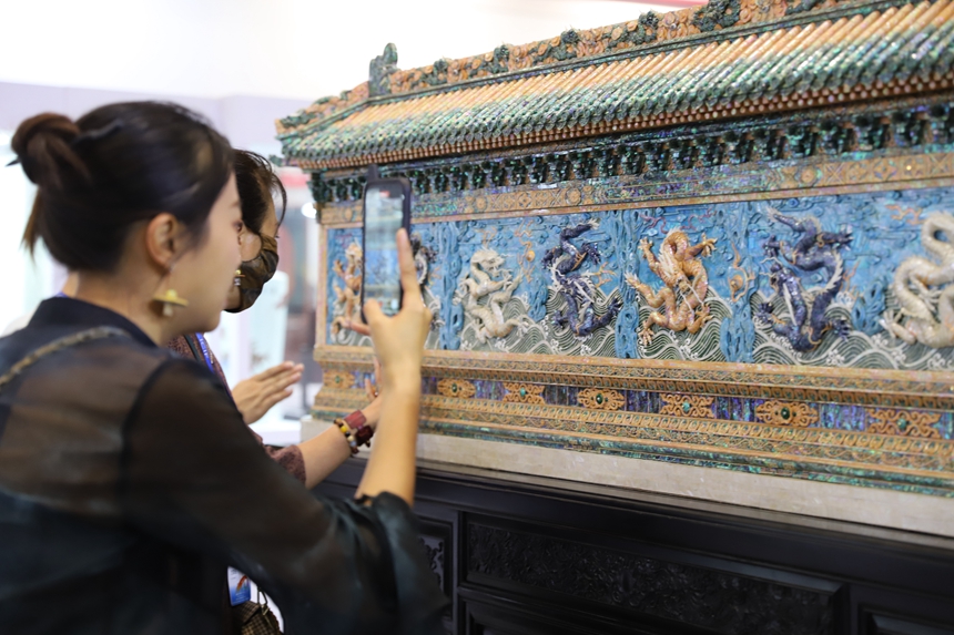 Visitors take pictures of a shell carving work featuring flying dragons during an exhibition of works by Chinese arts and crafts masters. (Photo/Cao Huanqing)