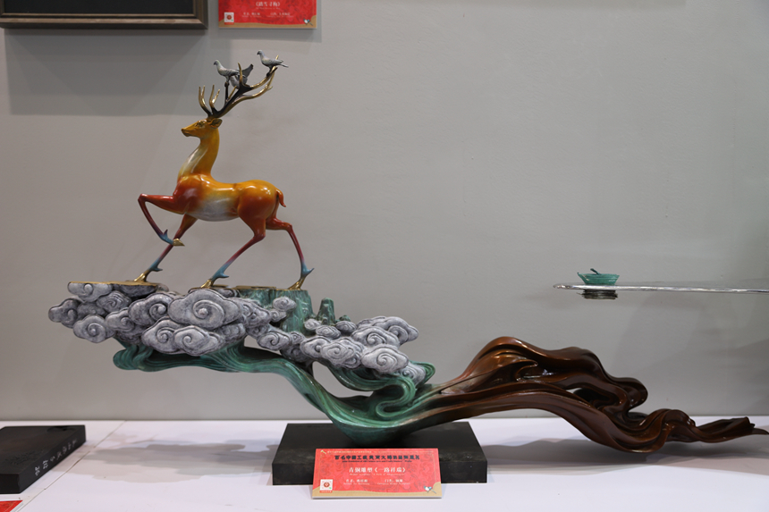 A bronze sculpture themed on auspiciousness is showcased during an exhibition of works by 100 Chinese arts and crafts masters. (Photo/Cao Huanqing)