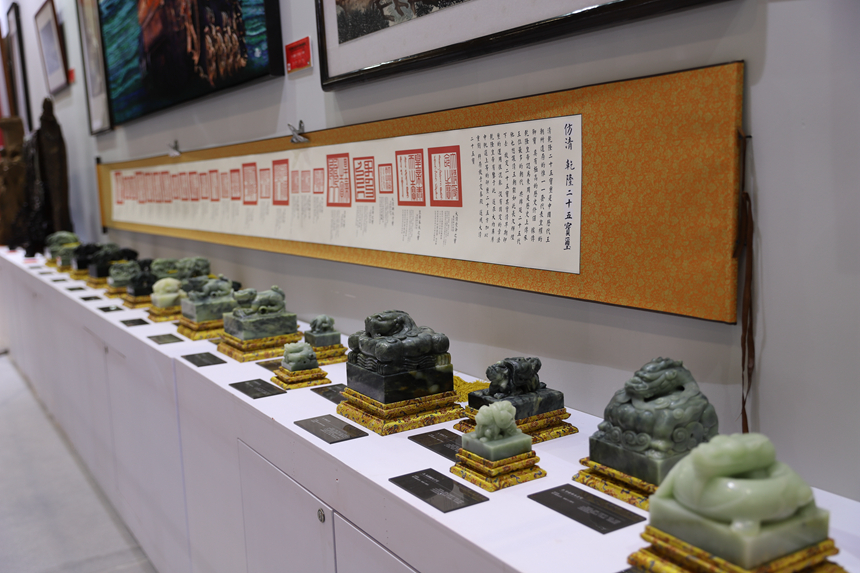 Stone carving works which are replicas of imperial jade seals used by Emperor Qianlong of the Qing Dynasty (1644-1911) are on display at an exhibition of works by Chinese arts and crafts masters. (Photo/Cao Huanqing)