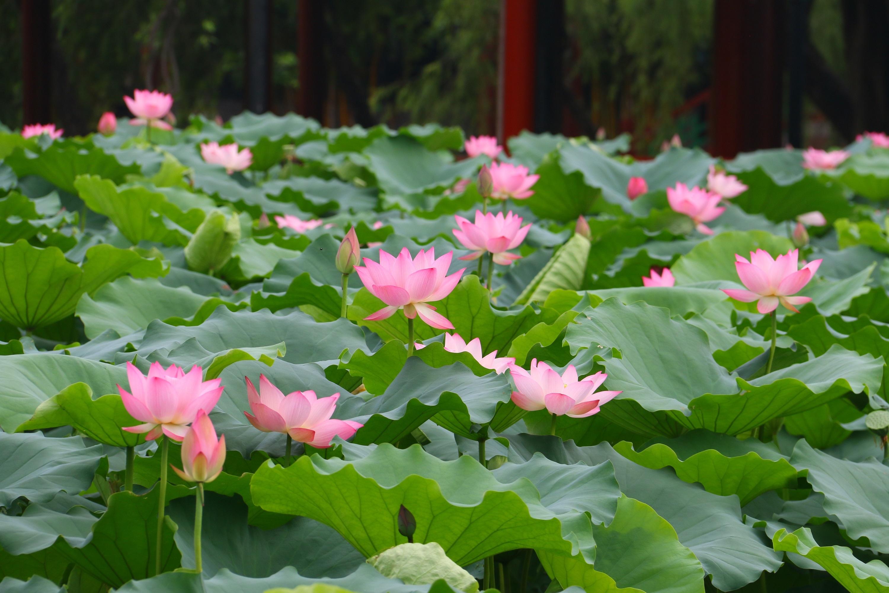 Under the blazing sun, the vivid lotus flowers unfurled amid a blanket of lush leaves. Pink petals swayed in the breeze, exuding elegance and grace.