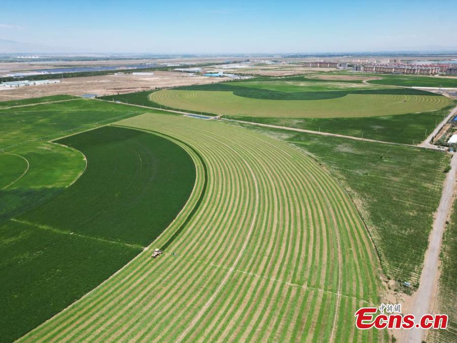 A harvester collects alfalfa at Minle County of Zhangye City, northwest China's Gansu Province. (Photo: China News Service/Yang Yanmin)