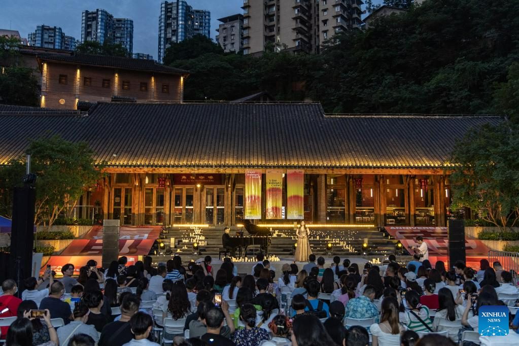 People enjoy a concert in celebration of the second anniversary of the opening of a museum displaying the history of Palace Museum antiques moved there during World War II in southwest China's Chongqing, June 10, 2023. The museum is located in a former foreign firm, where nearly 4,000 cases of antiques were stored during wartime.