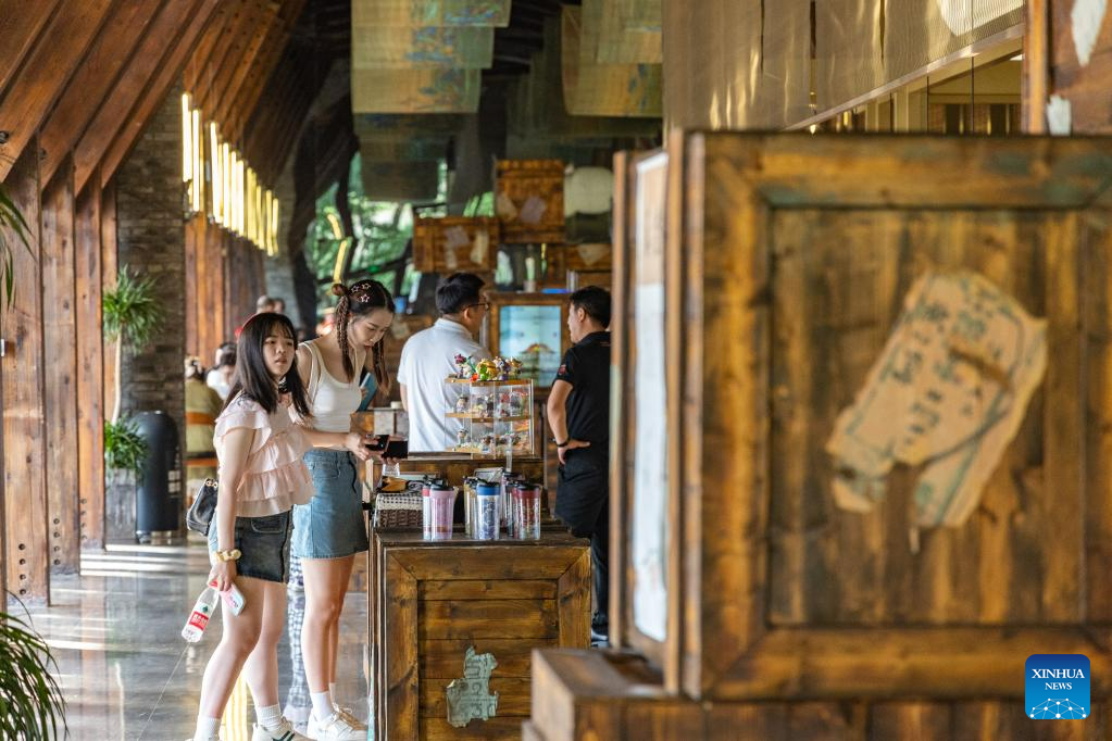Tourists select souvenir at a cafe of a museum displaying the history of Palace Museum antiques moved there during World War II in southwest China's Chongqing, June 10, 2023. The museum is located in a former foreign firm, where nearly 4,000 cases of antiques were stored during wartime.