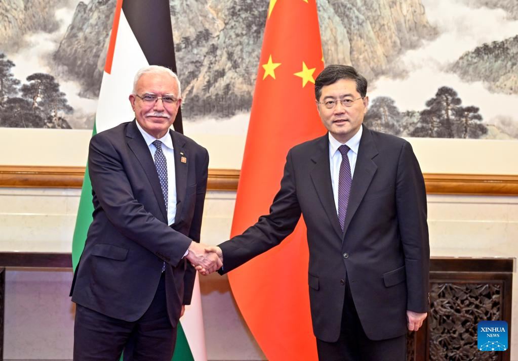 BEIJING, June 13 (Xinhua) -- Chinese State Councilor and Foreign Minister Qin Gang met with Palestinian Foreign Minister Riyad Al-Maliki in Beijing on Tuesday.