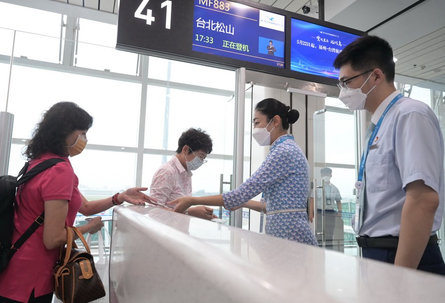Passengers get their boarding passes checked before boarding the Flight MF883 at the Fuzhou Changle International Airport in Fuzhou, capital of southeast China's Fujian Province, May 22, 2023. (Xinhua/Lin Shanchuan)