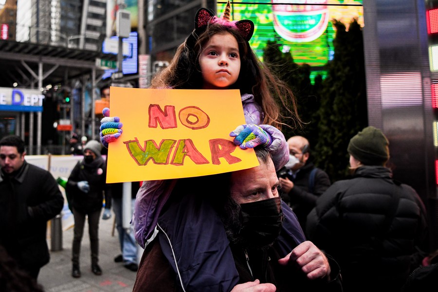 A child holds an anti-war sign during a rally at Times Square in New York, the United States, Jan. 14, 2023. (Photo by Ziyu Julian Zhu/Xinhua)