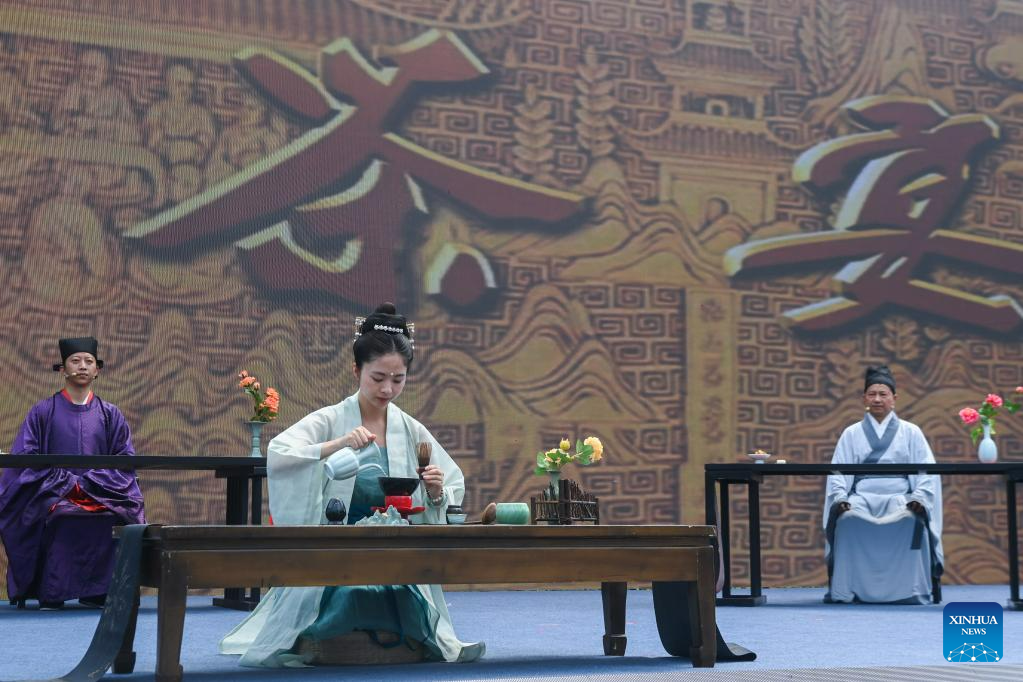 Jingshan Tea Ceremony is performed during an activity marking the Cultural and Natural Heritage Day in Hangzhou, east China's Zhejiang Province, June 9, 2023.