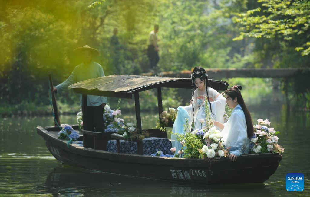 Actors in traditional Chinese costumes are pictured during a cultural event in the Xixi Wetland in Hangzhou, east China's Zhejiang Province, April 2, 2023.