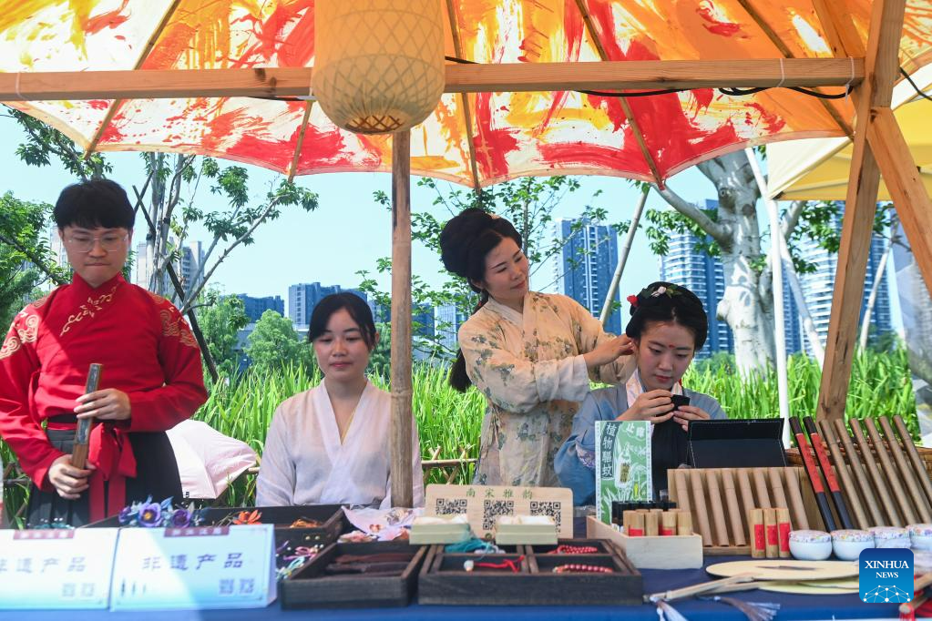 Intangible cultural heritage products are on display during an activity marking the Cultural and Natural Heritage Day in Hangzhou, east China's Zhejiang Province, June 9, 2023.
