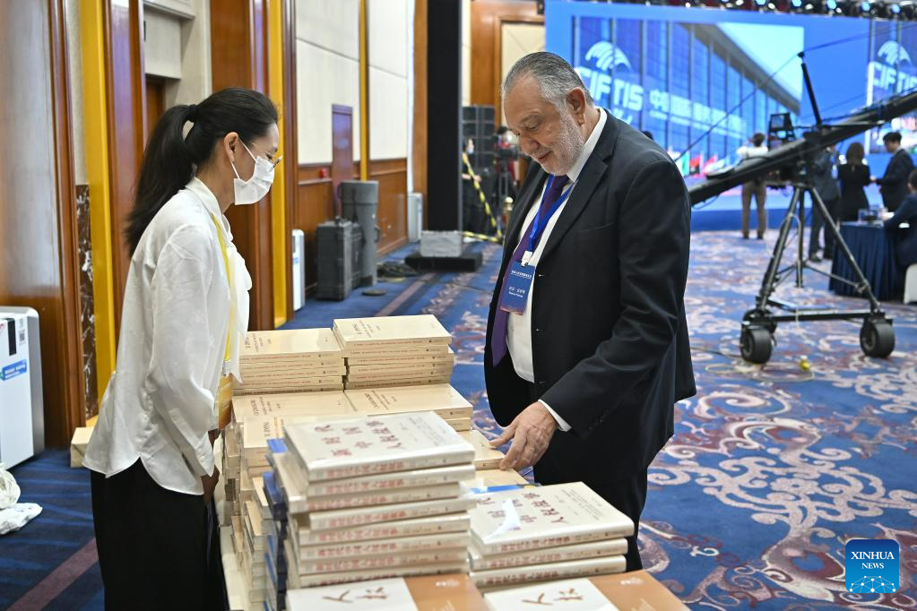 A participant receives relevant books during the Forum on Global Human Rights Governance in Beijing, capital of China, June 14, 2023. The Forum on Global Human Rights Governance opened in Beijing on Wednesday. (Xinhua/Li Xin)