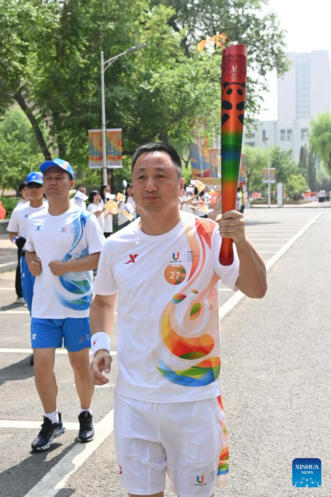 Torch bearer Ma Jun runs with the torch during the torch relay of the Chengdu 2021 FISU Summer World University Games at Harbin Institute of Technology in Harbin, northeast China's Heilongjiang Province, June 15, 2023. (Xinhua/Xie Jianfei)